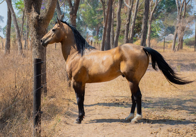 Bingo’s sire was imported from Germany to South Africa and Bingo is the only registered Quarter Horse Stallion in Zimbabwe. He came to us all the way from Cape Town where he had lived at Garland Stud since a foal. He was backed by them and trained for reining and still gets out under saddle, although these days just enjoys hacking and exploring the farm.