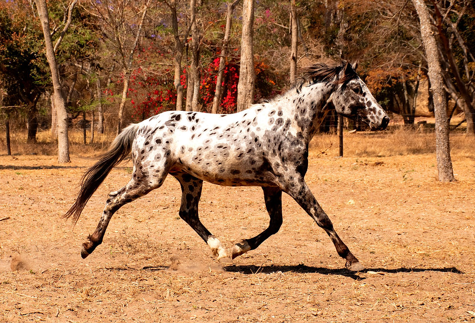 ​​Vumba’s markings are a result of him carrying one dominant LP gene, which forms the leopard spots on his coat. His spots with the lighter ring around them are called “peacock patterning” and are a rare finding in appaloosa horses. His base colour is smokey black, which forms when a horse carries a creme gene on a black base, so he can breed black, palomino, buckskin, perlino and cremello offspring.